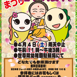 お釈迦様の誕生日前(4月8日当日は世尊院で行っていますのでお立ち寄りください)ですが、ぜひ遊びがてら、ご参拝いただければと思います。先着100名になりますが来場者さまに甘茶を用意しております。(日本茶、ジュース、お菓子等のご用意もあります※予定量がなくなり次第終了)
