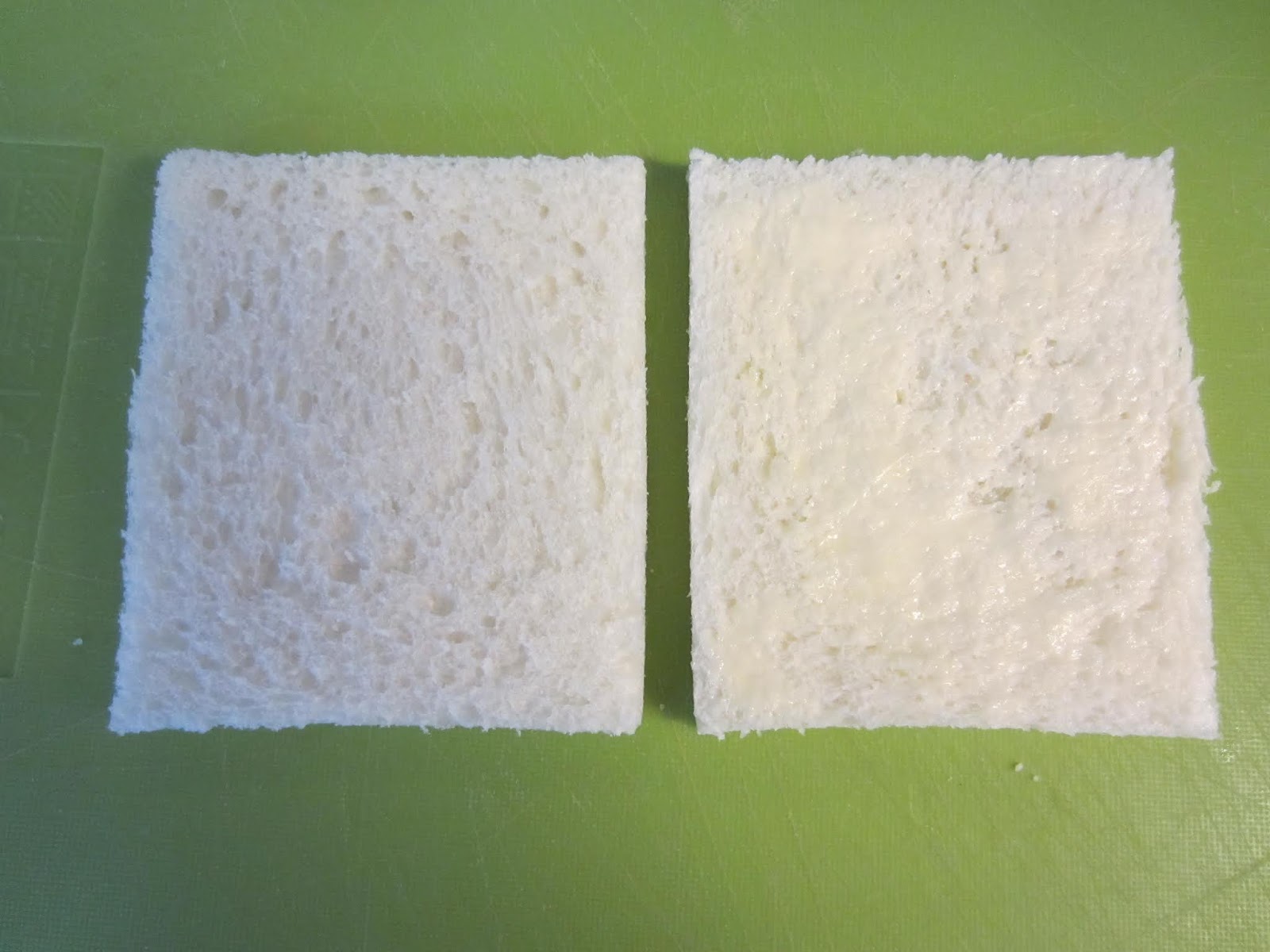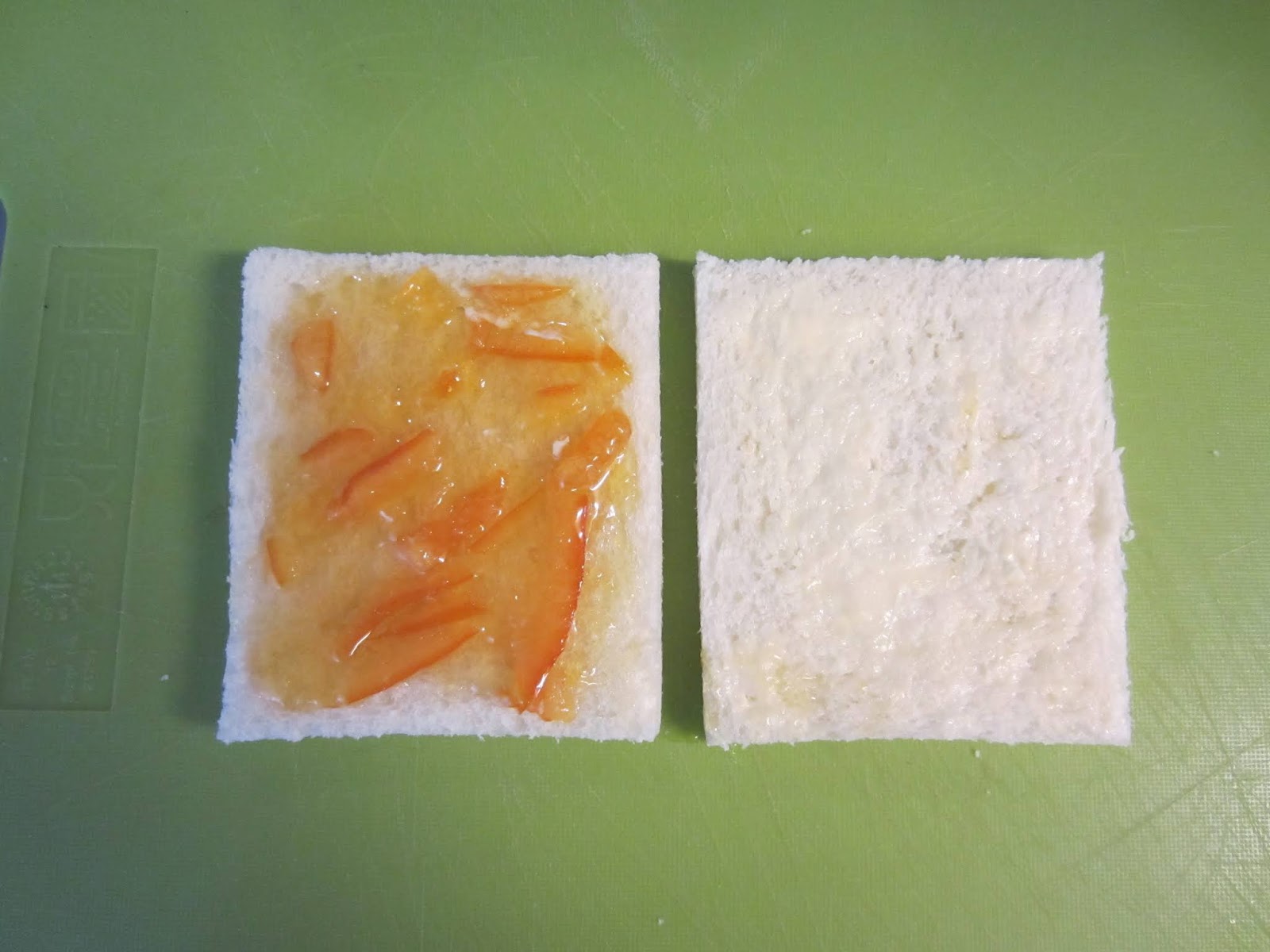 ②柔らかくしたバターをごく薄く塗る (マーマレードの水分でパンが湿らないようにするため)