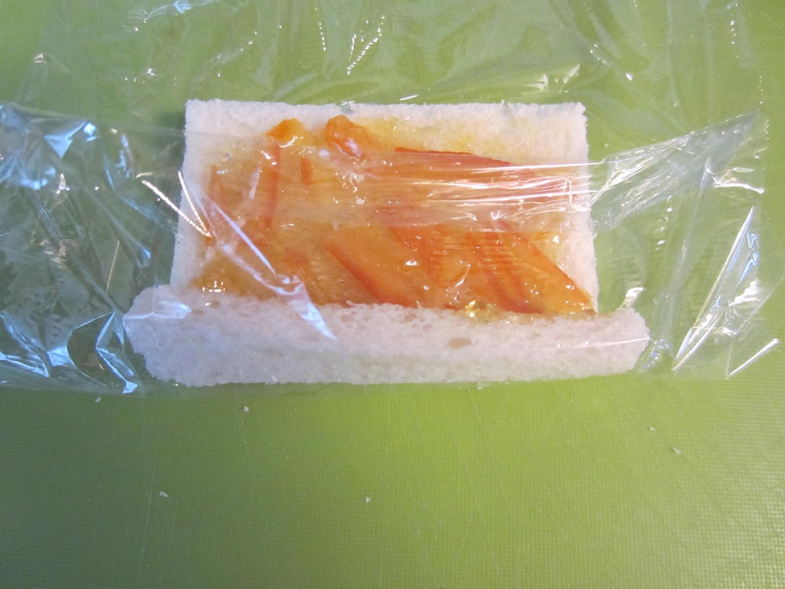 ⑤バターを塗ったもう1枚のパンを重ね、ラップで包み3分程度休ませる(具材とパンを密着させ