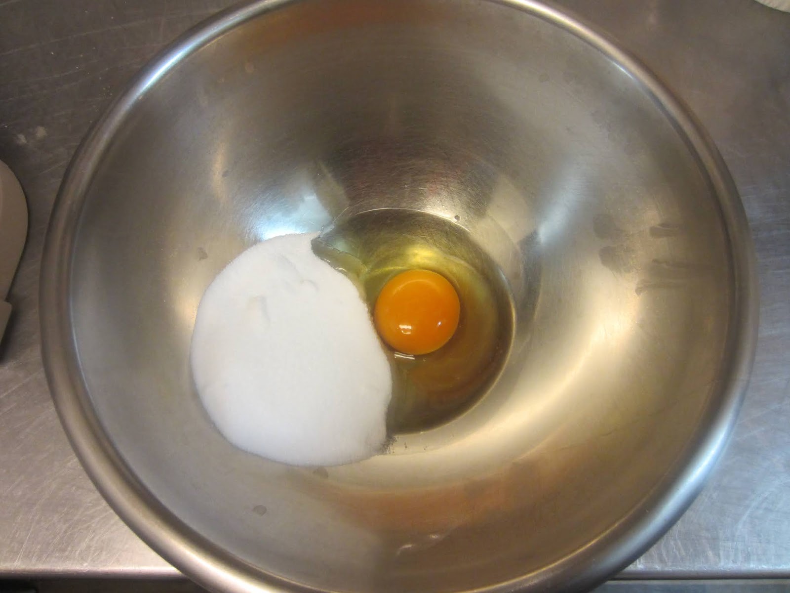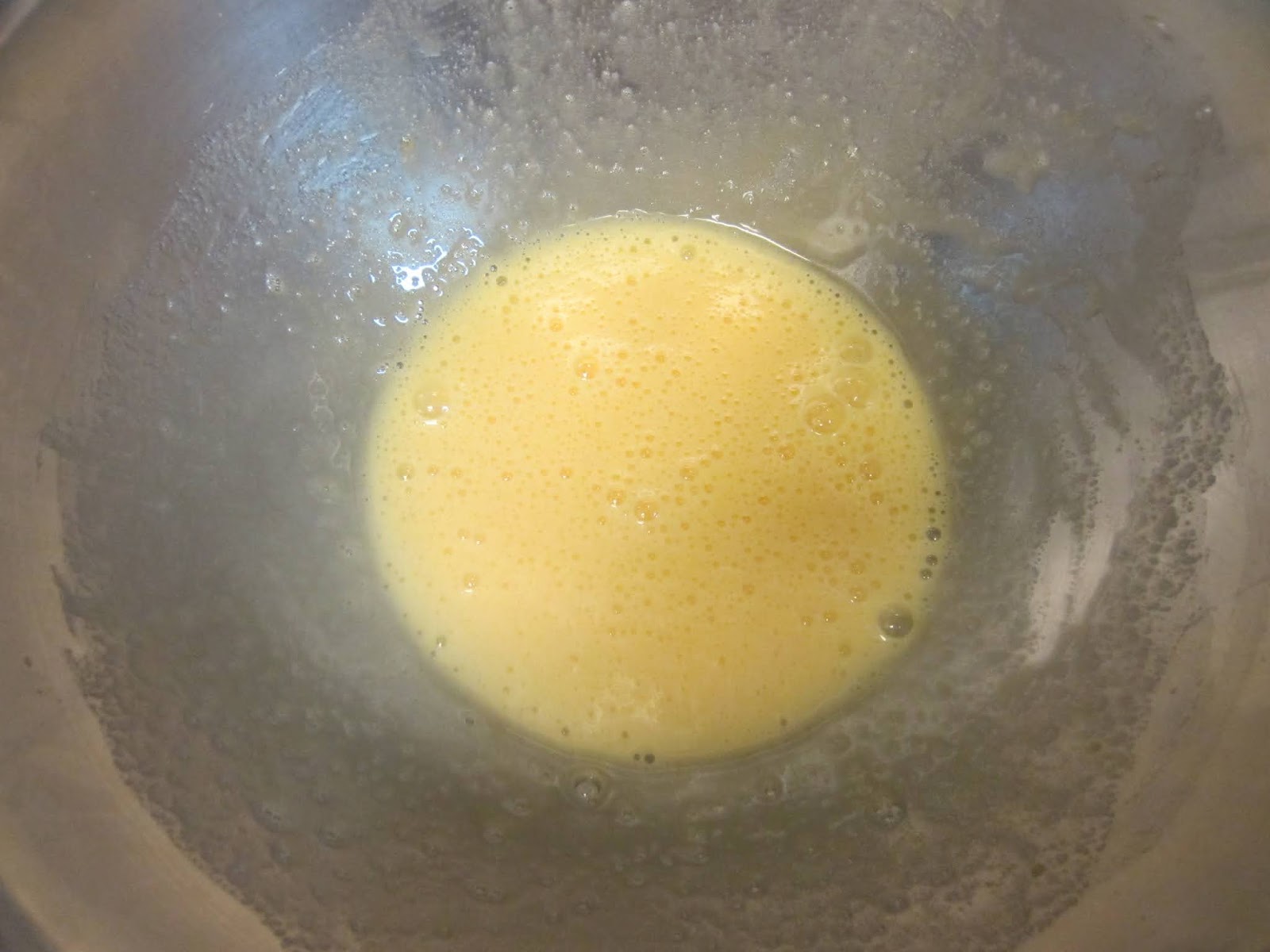 ①ボールで卵と砂糖を一緒にし砂糖が溶け少し白っぽくなるまで泡立て器で攪拌する