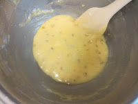 ②①にレモン皮の砂糖漬、振るった粉類を加えこねないように混ぜる