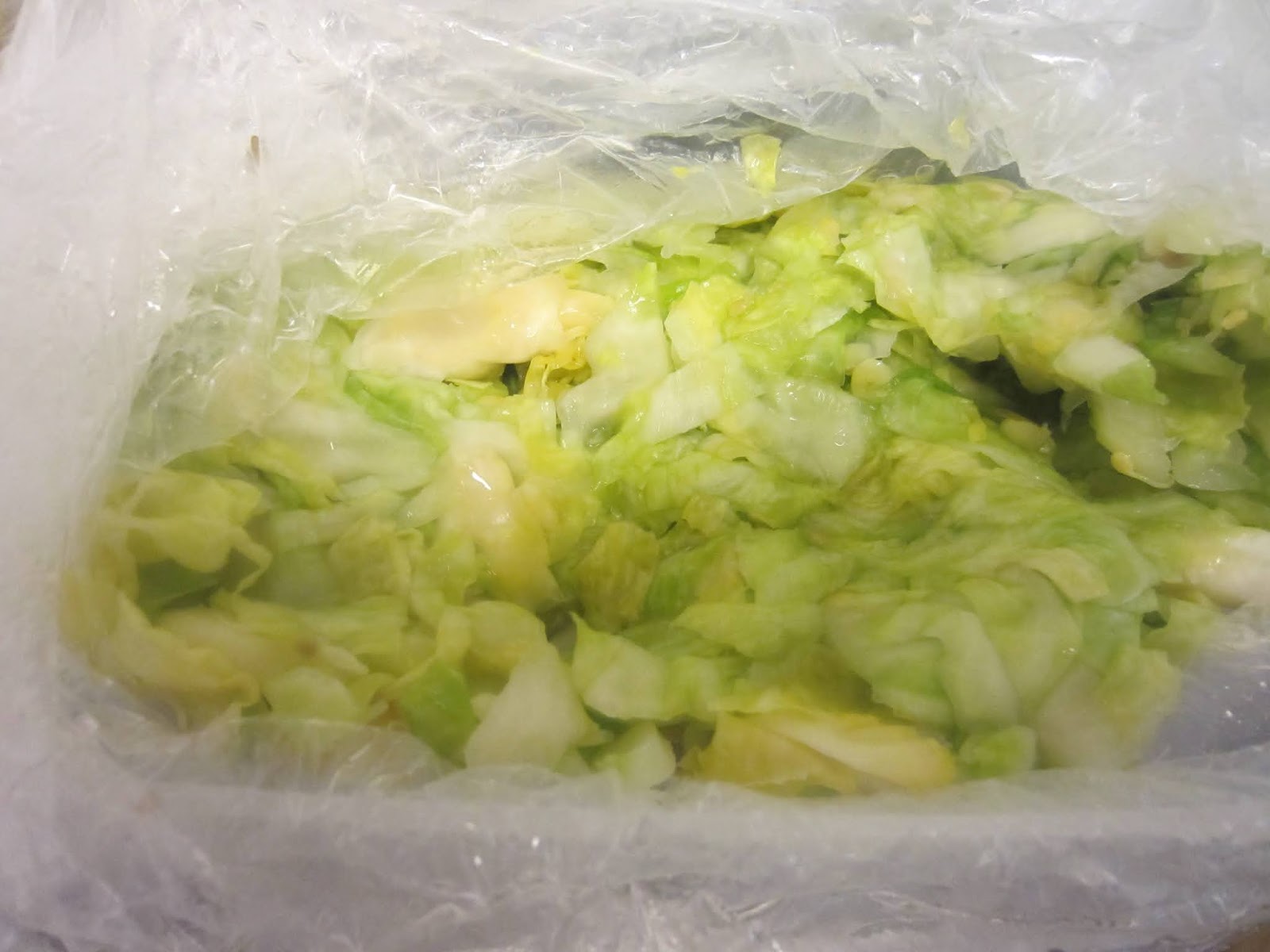 ジッパー付きの袋に千切りしたキャベツ、塩、砂糖少量、好みのハーブ(月桂樹やローズマリー、粒胡椒など)を入れ軽く混ぜ合わせます